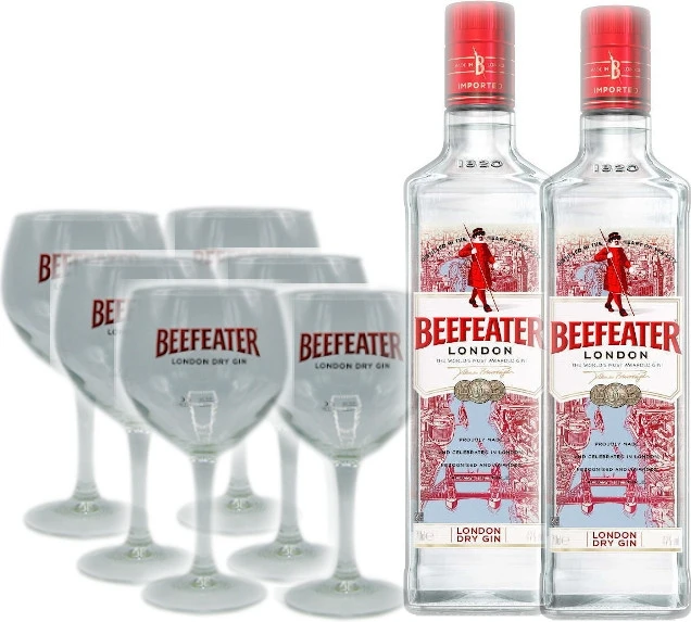 Zwei Flaschen London Dry Gin von Beefeater mit 40% vol.Alc. in der 0,7l Flasche mit 6 Beefeater Gläsern