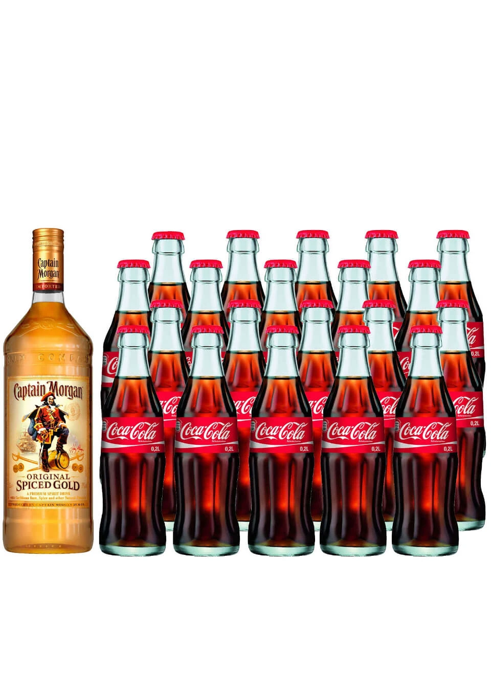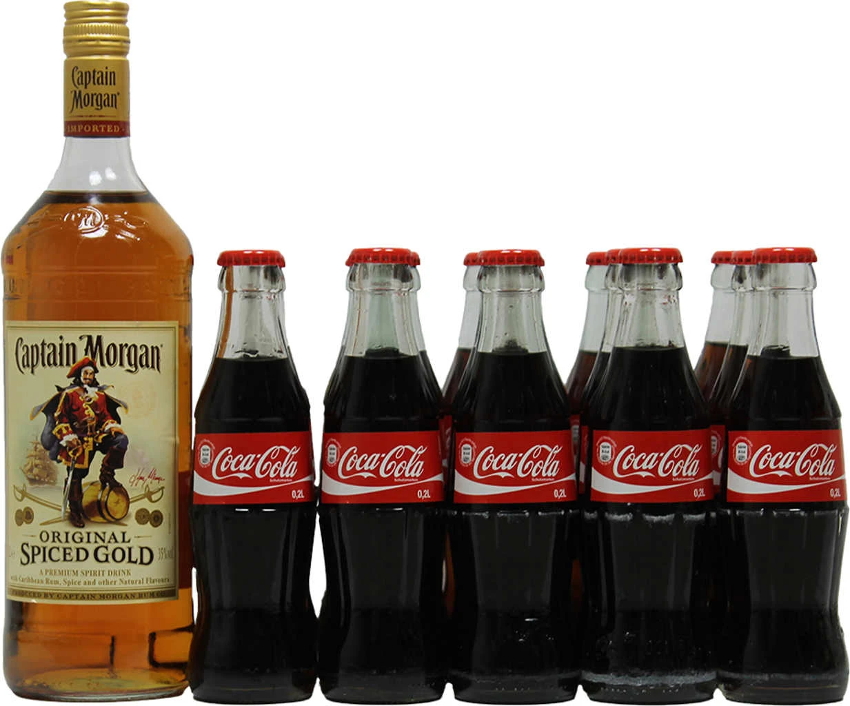 An alle Karibik-Liebhaber: mit unserem Captain Cola Set groß erhalten Sie ein partytaugliches Set mit einem Liter Captain Morgan Spiced Gold und 20 Flaschen Coca Cola zu je 0,2l! Damit sind Sie mit Sicherheit für jedes Event gerüstet. Egal ob Afterwork-Partys, Barbecues oder Pokerabende, Captain Cola Set groß wird stets begeistern. Praktischerweise sind Sie bei diesem Set nicht auf große Colaflaschen angewiesen, die dann zuhauf geöffnet werden und am nächsten Tag, wenn sie warm und schal geworden sind, weggeschüttet werden müssen. Mit Captain Cola Set erhält jeder Gast sein eigenes 0,2l-Fläschchen und hat so die Möglichkeit, seinen Drink nach Belieben zu mixen. Geben Sie zu Captain Cola noch eine Prise Rohrzucker sowie ein paar Limetten-Schnitten und Crushed Ice und Sie halten einen klassischen Cuba Libre in Händen.