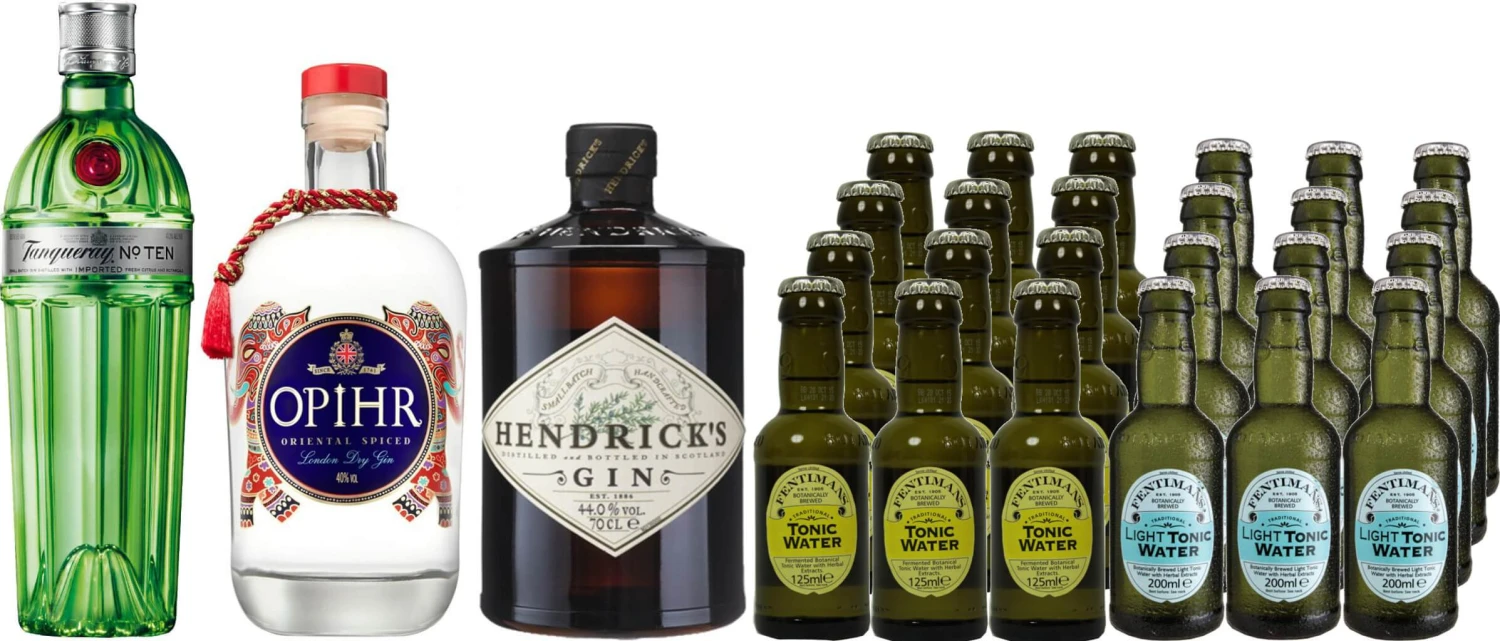 Gin Tasting Set mit 3 Gins in 0,7l mit 40-47,3% Vol. und 24 Tonic Water in 0,2l zzgl. 6 € Pfand