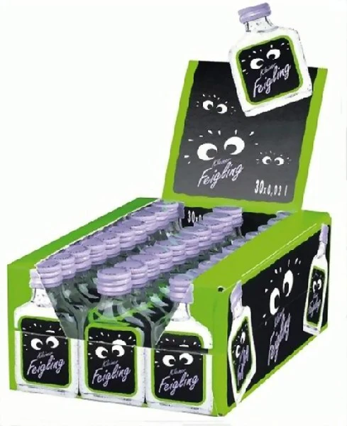 Der Kleine Feigling ist einer der bekanntesten und beliebtesten „Klopfer“ Deutschlands. Er wird aufgrund des Alkoholgehaltes von 20% nur an volljährige Personen verkauft. Dennoch ist das Emblem dieses Likörs ist vor allem durch zahlreiche im Handel erhältliche Fanartikel bekannt geworden. Besonders günstig kann der Kleine Feigling hier in unserem online Shop bestellt werden. Am idealsten bieten sich die 30 kleinen Klopfer mit einem Inhalt von je 2 cl an, da diese, in mundgerechter Menge verpackt, ein echter Muss für jede Party sind. Das Fläschchen wird zunächst mehrmals mit dem Deckel auf eine harte Oberfläche geklopft (daher auch der Name „Klopfer“). Anschließend werden die Deckel abgeschraubt und auf die Nasenspitze gesetzt um dann den Kleinen Feigling zwischen die Zähne zu klemmen. Nachdem man sich nun gegenseitig mit dem Fläschchen angestoßen hat, kippt man den Kopf nach hinten und trinkt den Inhalt auf ein Mal aus. Sind sie also im Begriff auf eine Party zu gehen, sollten sie diesen günstigen Partykracher unbedingt bestellen.
