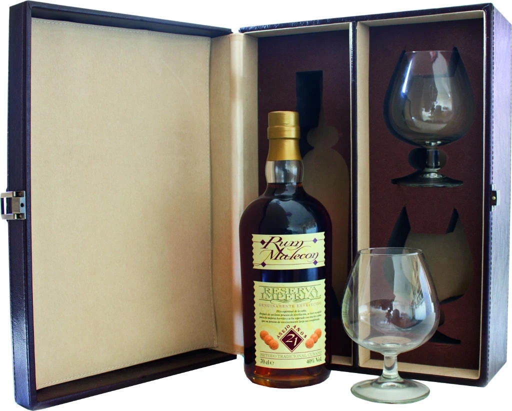 Jetzt präsentiert sich der Rum Malecon 21 Jahre Reserva Imperial in einem neuen, prunkvollen Geschenkkoffer. Er beinhaltet eine 0,7 Liter Flasche zusammen mit 2 exklusiven Ron Malecon Gläsern. Die Geschenkbox ist genau darauf zugeschnitten und kommt in eleganter brauner Lederoptik daher. Das ideale Geschenk für jeden Rumliebhaber.